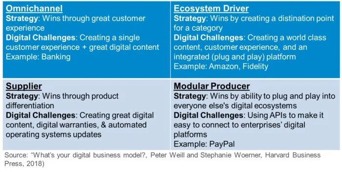 The ability to integrate with partners through a supply chain has always been a successful business model for many companies (i.e. shampoo in hotels, specific vehicle models as rental cars). But in the digital world it takes it up a notch. In this model, companies create APIs that can plug into other organizations ecosystem. The example that Weill & Woerner give is PayPal - having the ability to integrate across many e-commerce platforms. As more traditional organizations begin to add digital experiences to their offering, this could be a great strategy to explore to scale.